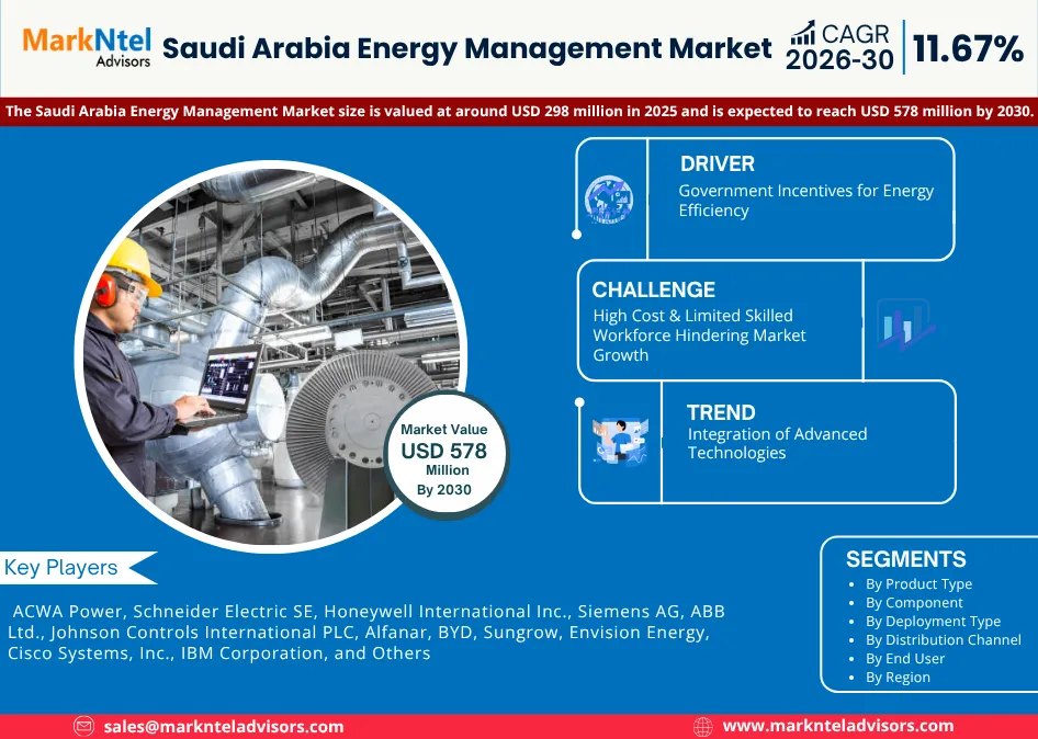 According to MarkNtel Advisors study The future of Saudi Arabia Energy Management Market size is valued at around USD 298 million in 2025 and is expected to reach USD 578 million by 2030. Along with this, the market is estimated to grow at a CAGR of around 11.67% during the forecast period, i.e., 2026-30.