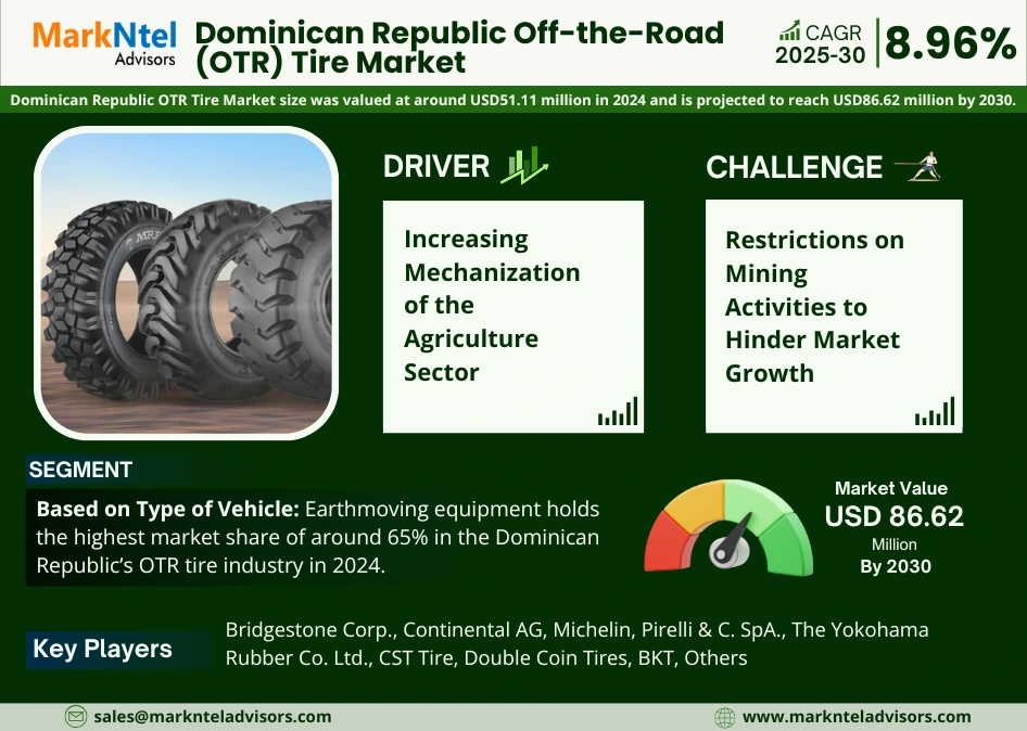 According to MarkNtel Advisors study The future of Dominican Republic Off-the-Road (OTR) Tire Market size was valued at around USD51.11 million in 2024 and is projected to reach USD86.62 million by 2030. Along with this, the market is estimated to grow at a CAGR of around 8.96% during the forecast period, i.e., 2025-30.