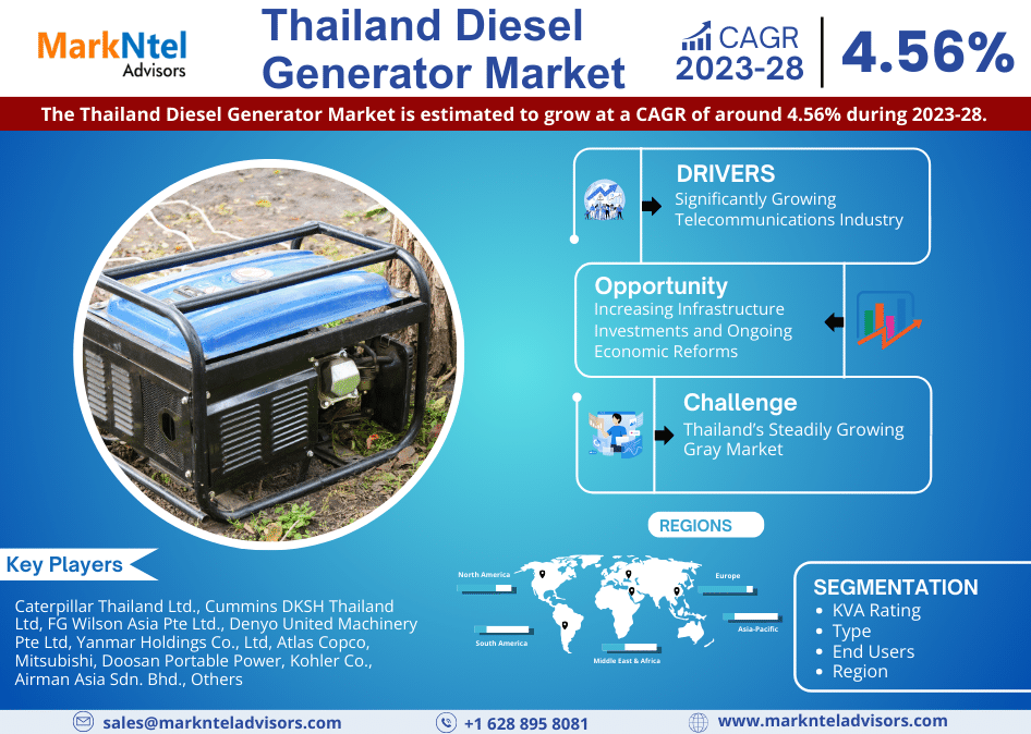 According to MarkNtel Advisors study The future of Thailand Diesel Generator Market is estimated to grow at a CAGR of around 4.56% during the forecast period, i.e., 2023-28.