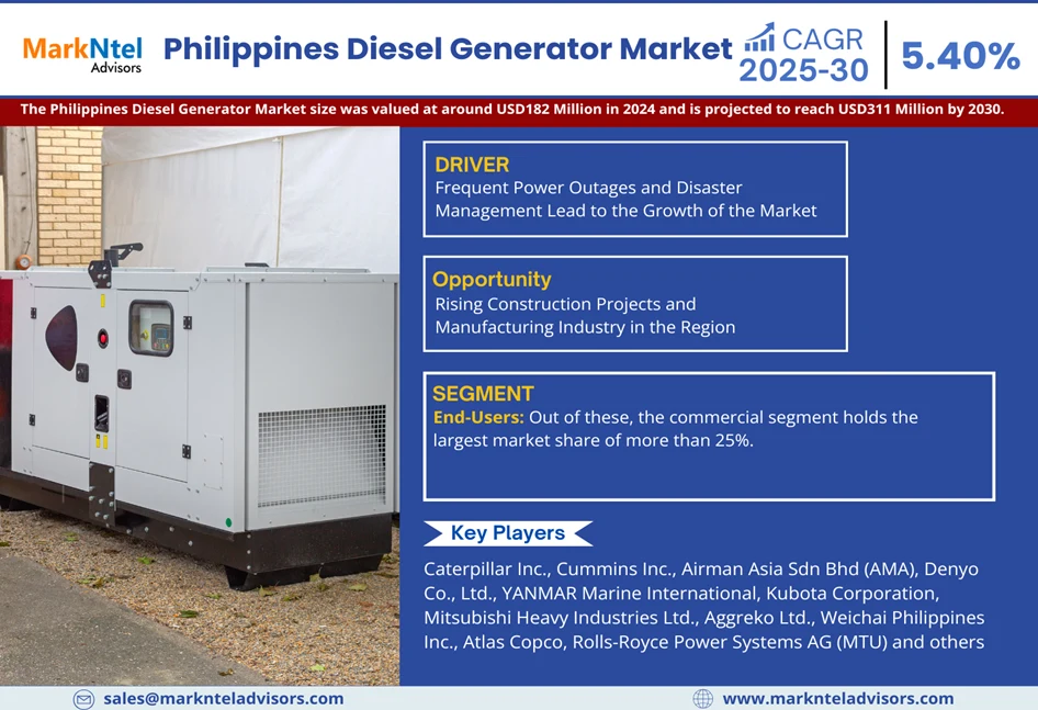 According to MarkNtel Advisors study The future of Philippines Diesel Generator Market size was valued at around USD182 Million in 2024 and is projected to reach USD 311 Million by 2030. Along with this, the market is estimated to grow at a CAGR of around 5.40% during the forecast period, i.e., 2025-30.