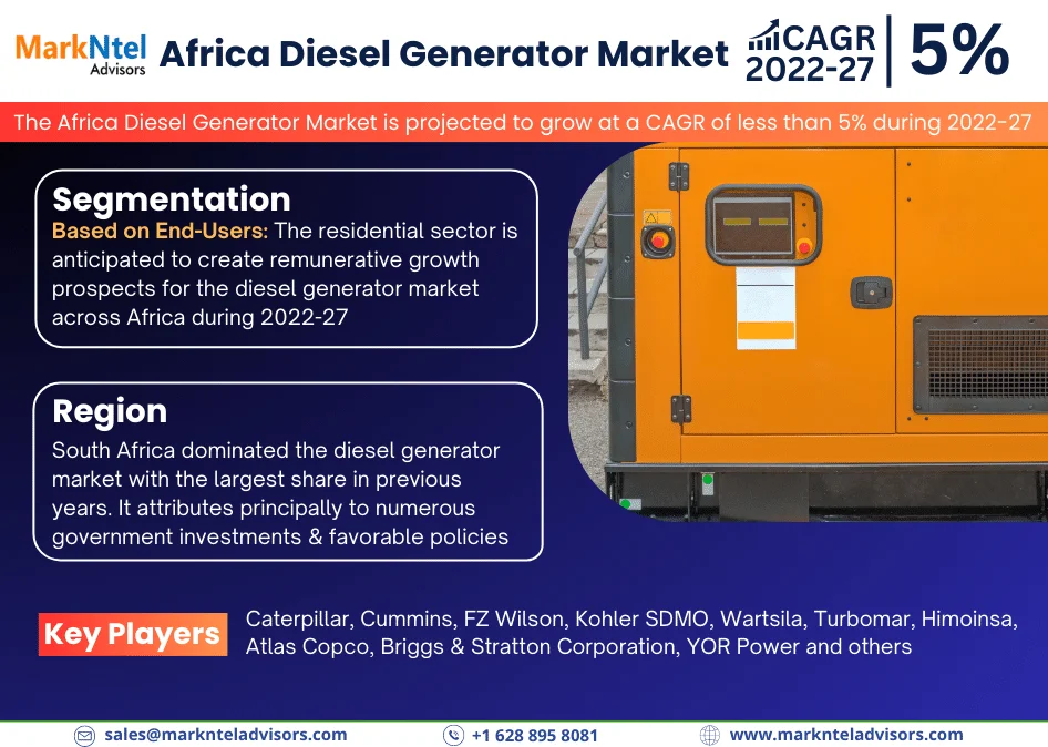 According to MarkNtel Advisors study The future of Africa Diesel Generator Market is projected to grow at a CAGR of less than 5% during the forecast period, i.e., 2022-27. The growth of the market is driven primarily by increasing infrastructural development projects for healthcare, hospitality, residential, commercial, & industrial, among other sectors, i.e.