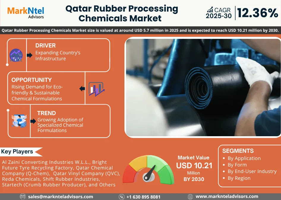 As per recent study by Markntel Advisors The Qatar Rubber Processing Chemicals Market size is valued at around USD 5.7 million in 2025 and is expected to reach USD 10.21 million by 2030. Along with this, the market is estimated to grow at a CAGR of around 12.36% during the forecast period, i.e., 2025-30.