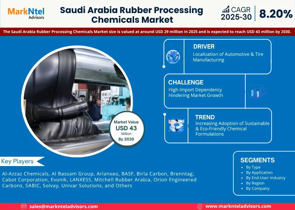 As per recent study by Markntel Advisors The Saudi Arabia Rubber Processing Chemicals Market size is valued at around USD 29 million in 2025 and is expected to reach USD 43 million by 2030. Along with this, the market is estimated to grow at a CAGR of around 8.20% during the forecast period, i.e., 2025-30.
