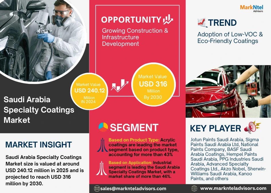 As per recent study by Markntel Advisors The Saudi Arabia Specialty Coatings Market size is valued at around USD 240.12 million in 2025 and is projected to reach USD 316 million by 2030. Along with this, the market is estimated to grow at a CAGR of around 5.65% during the forecast period, i.e., 2025-30.