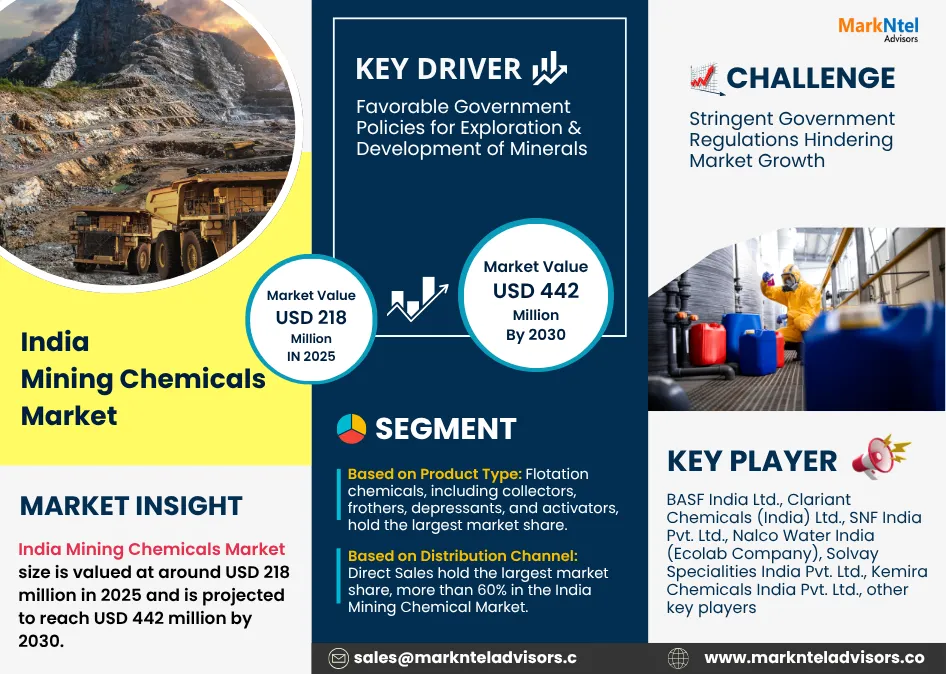 As per recent study by Markntel Advisors The India Mining Chemicals Market size is valued at around USD 218 million in 2025 and is projected to reach USD 442 million by 2030.