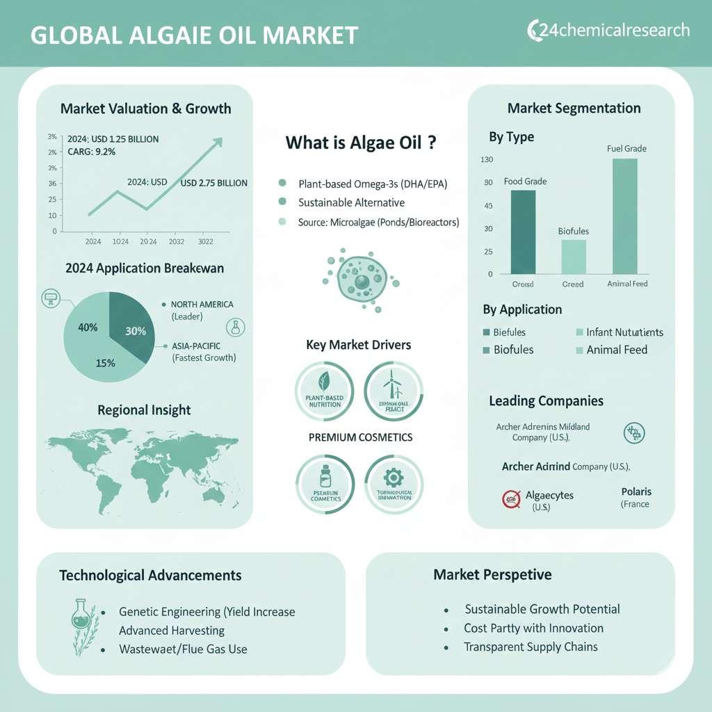 Global algae oil market is emerging as a critical solution at the nexus of nutrition, energy, and sustainability. Valued at USD 1.25 billion in 2024, it is projected to more than double, reaching USD 2.75 billion by 2032, propelled by a robust CAGR of 9.2%. This plant-based oil, rich in omega-3s (DHA and EPA), is transcending its niche status, fueled by converging trends: the global shift toward renewable resources, the explosive growth of plant-based nutrition, and the urgent need for decarbonization. However, the industry’s promising trajectory is tempered by the significant technical and economic hurdles of scaling production to meet this burgeoning demand.