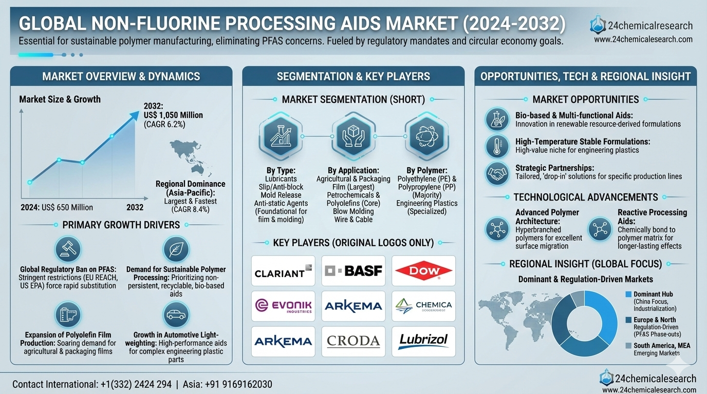 The global non-fluorine processing aids market, valued at approximately US$ 650 million in 2024, is on a strong upward trajectory, projected to reach US$ 1,050 million by 2032, growing at a CAGR of 6.2%. This growth is propelled by the global regulatory phase-out of PFAS. Regionally, Asia-Pacific is the largest and fastest-growing market (CAGR 8.4%), led by China's massive polymer production, while North America and Europe follow, driven by stringent environmental regulations.