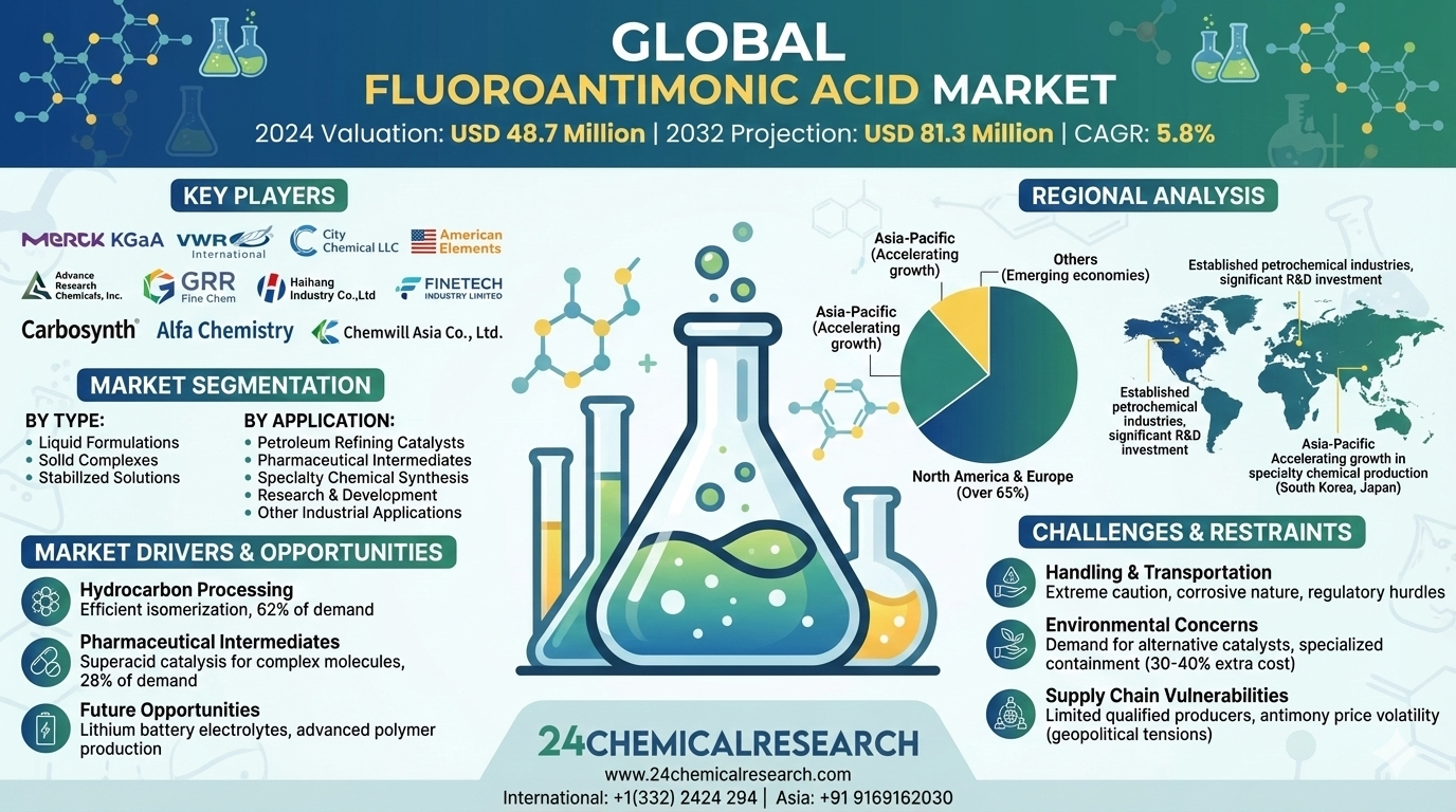 Global Fluoroantimonic Acid market demonstrates steady expansion, with its 2024 valuation reaching USD 48.7 million. As the strongest known superacid, this specialized chemical compound is projected to grow at a CAGR of 5.8% through 2032, potentially reaching USD 81.3 million. This growth trajectory stems from increasing applications in petroleum refining, catalyst production, and specialized chemical synthesis, particularly within advanced industrial economies.