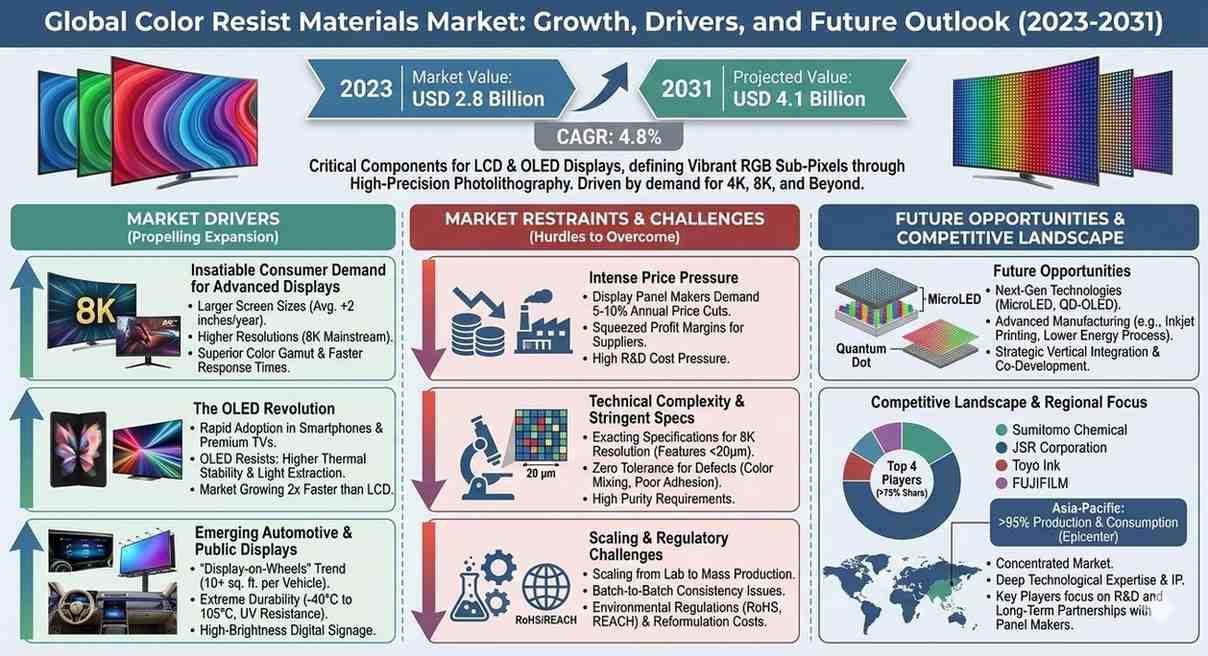 Scaling up new material formulations from laboratory samples to mass production volumes of thousands of tons per year is a non-trivial endeavor. Consistency is paramount; batch-to-batch variations in viscosity, pigment dispersion, or photosensitivity can disrupt high-speed panel production lines, leading to substantial financial losses. Furthermore, the rapid pace of display technology evolution means that the commercial lifespan of a specific color resist formulation is often shorter than the time required to recoup the initial R&D investment. This creates a "innovation treadmill" where companies must continually invest in next-generation materials even as current products are still being ramped into production.