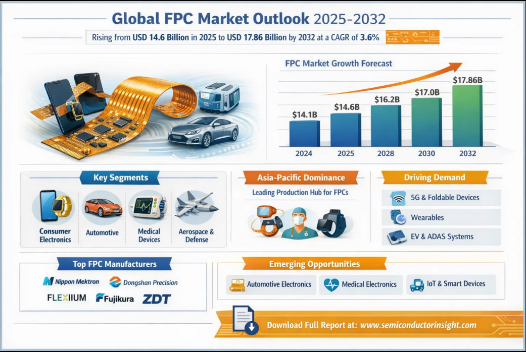 Global FPC Market to Reach $17.86B by 2032 Fueled by Consumer Electronics & Automotive Innovation Global FPC Market, valued at a robust USD 14,100 million in 2024, is poised for steady growth, projected to progress from USD 14,600 million in 2025 to USD 17,860 million by 2032. This expansion, at a compound annual growth rate (CAGR) of 3.6%, is detailed in a comprehensive new report published by Semiconductor Insight. The analysis underscores the indispensable role of flexible printed circuits in enabling the miniaturization, lightweight design, and high-performance functionality demanded by modern electronic devices across diverse sectors. Get Full Report Here: https://semiconductorinsight.com/report/fpc-market/ 🌐 Website: https://semiconductorinsight.com/ 📞 International: +91 8087 99 2013 🔗 LinkedIn: Follow Us #FPCMarket #FlexiblePrintedCircuit #FlexibleElectronics #ConsumerElectronics #ElectronicsManufacturing #PCBTechnology #AutomotiveElectronics #WearableTechnology #MedicalElectronics #IoTDevices #SmartDevices #ElectronicsIndustry #TechInnovation #MarketGrowth #GlobalMarket #SemiconductorIndustry #SemiconductorInsight