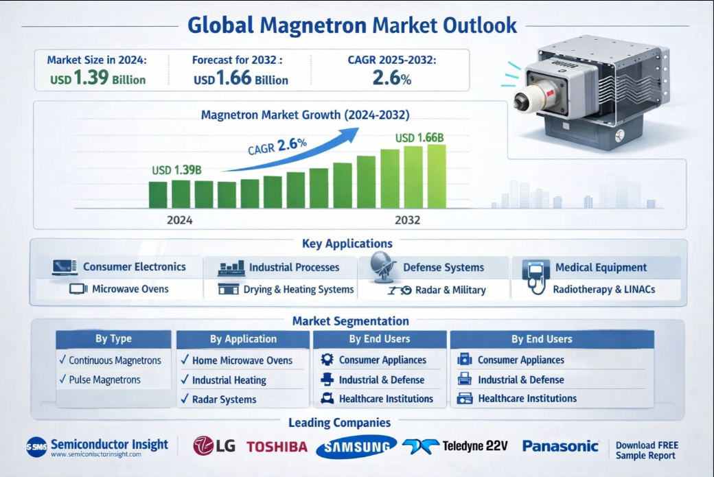 Global Magnetron Market is experiencing steady technological evolution and market expansion, with its size valued at USD 1.39 billion in 2024 and projected to reach USD 1.66 billion by 2032, exhibiting a compound annual growth rate (CAGR) of 2.6% during the forecast period. This sustained growth trajectory is detailed in a comprehensive new market intelligence report from Semiconductor Insight, which highlights the enduring significance of magnetrons across consumer electronics, industrial processes, and advanced defense systems. As a critical component for generating microwave radiation, the magnetron continues to be indispensable in applications ranging from household cooking to sophisticated radar and medical equipment.