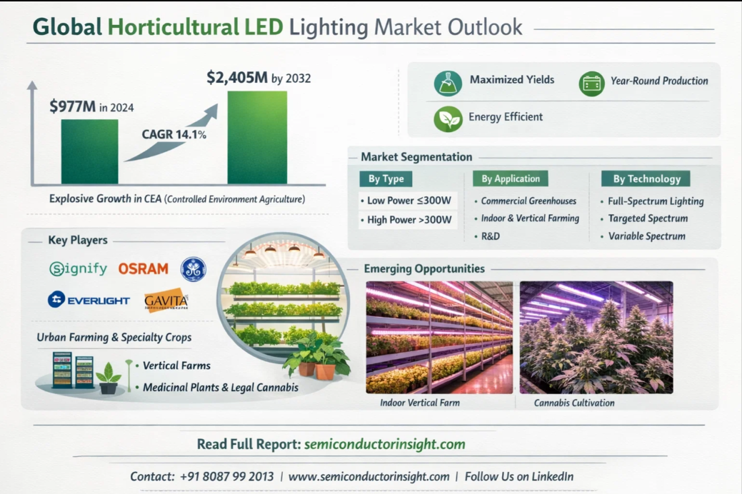 #HorticultureLED #LEDLightingMarket #SmartFarming #VerticalFarming #GreenhouseTechnology #AgriTech #SustainableAgriculture #IndoorFarming #MarketGrowth #LEDInnovation #FutureFarming #PrecisionAgriculture #CEA #UrbanFarming #SemiconductorInsight