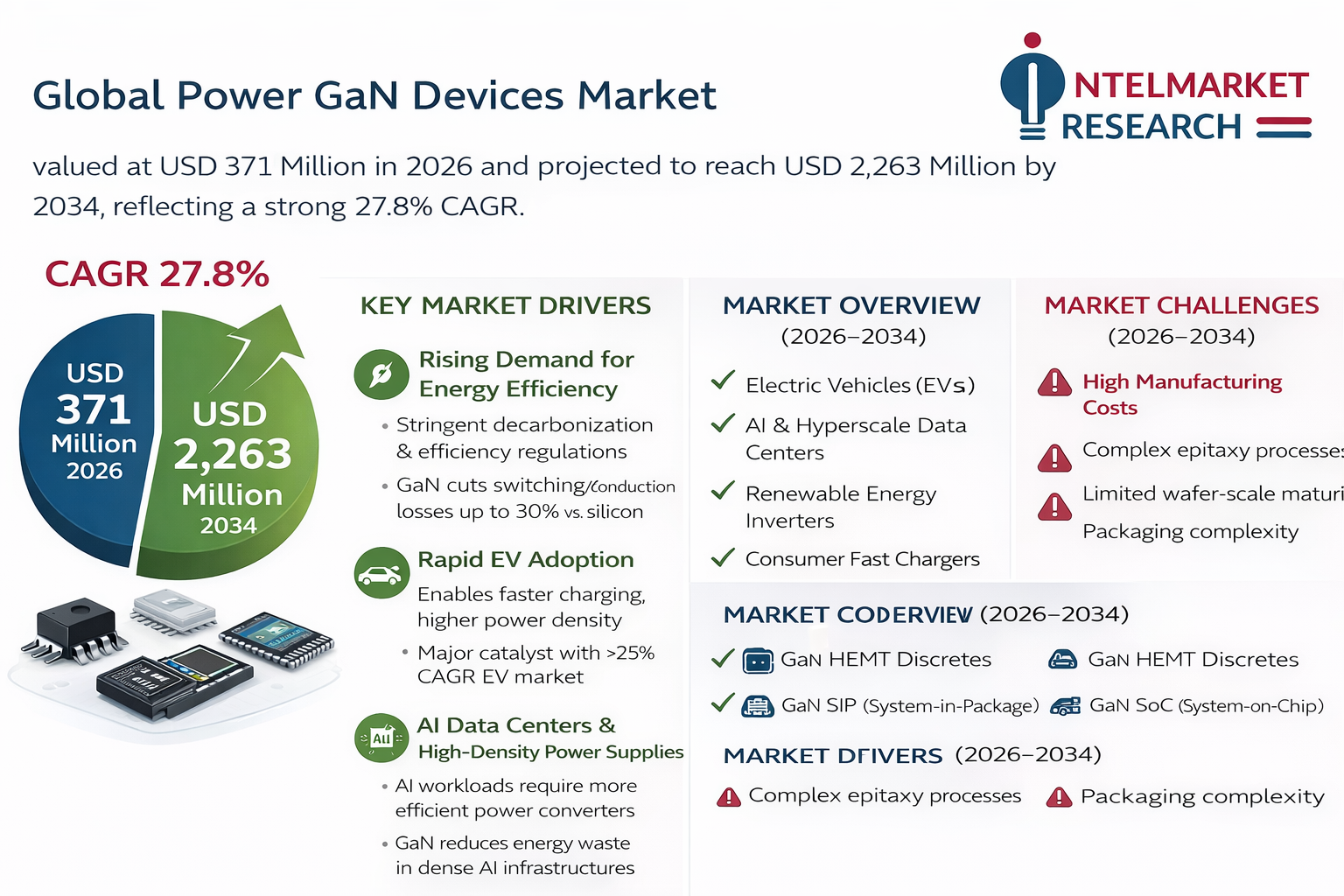 Is the Power GaN Devices Market Set to Surge to USD 2.26 Billion by 2034 at a 27.8% CAGR Amid EV and AI Data Center Expansion? The global Power GaN (Gallium Nitride) Devices market, valued at USD 371 million in 2026, is projected to reach USD 2,263 million by 2034, reflecting a strong 27.8% CAGR. Extending the forecast to 2026–2034, the market is expected to sustain high double-digit growth, driven by EV electrification, AI data centers, renewable energy systems, and 5G infrastructure. To understand this exponential growth trajectory, the compound growth formula applies: FV=PV(1+r)nFV = PV(1 + r)^nFV=PV(1+r)n With a CAGR of 27.8%, the market could exceed USD 3.5–4.0 billion by 2034, assuming continued EV penetration, data center expansion, and scaling manufacturing efficiencies. https://www.intelmarketresearch.com/power-gan-devices-market-22871