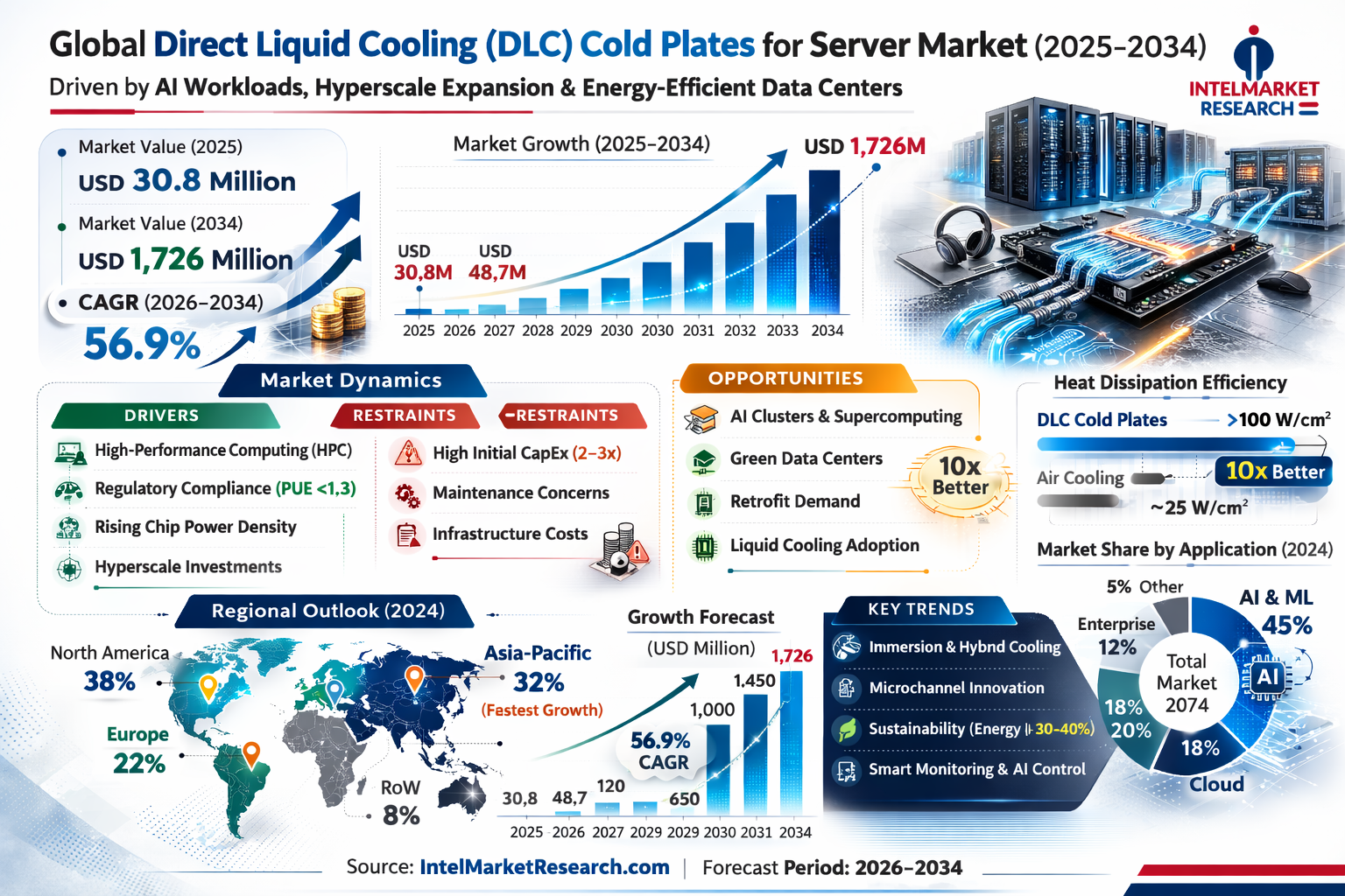 The Global Direct Liquid Cooling (DLC) Cold Plates for Server Market was valued at USD 30.8 million in 2025 and is projected to grow from USD 48.7 million in 2026 to USD 1,726 million by 2034, registering an exceptional CAGR of 56.9% during the forecast period.