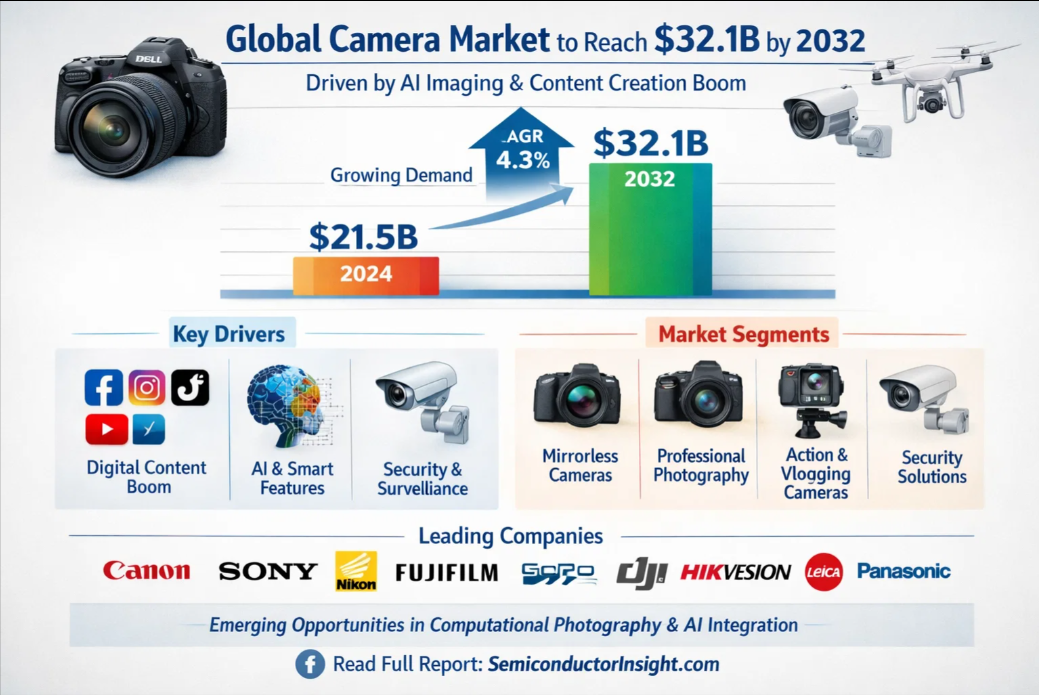 Global Camera Market to Reach $32.1B by 2032 Driven by AI Imaging & Content Creation Boom Global Camera Market, valued at a robust USD 21.5 billion in 2024, is on a steady growth trajectory, projected to reach USD 32.1 billion by 2032. This expansion, representing a compound annual growth rate (CAGR) of 4.3%, is detailed in a comprehensive new report published by Semiconductor Insight. The study highlights the enduring demand for imaging solutions across consumer, professional, and industrial applications, despite the proliferation of smartphone cameras. Cameras, essential for capturing, creating, and communicating in our visually-driven world, are becoming increasingly sophisticated, integrating advanced computational photography and connectivity features. Read Full Report: https://semiconductorinsight.com/report/camera-market/ 🌐 Website: https://semiconductorinsight.com/ 📞 International: +91 8087 99 2013 🔗 LinkedIn: Follow Us #CameraMarket #DigitalCameraMarket #MirrorlessCamera #DSLR #ContentCreation #PhotographyIndustry #ImagingTechnology #AICamera #ComputationalPhotography #SecuritySurveillance #SmartCameras #MarketGrowth #TechIndustry #SemiconductorInsight #GlobalMarket #CameraIndustry